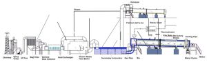 El material se introduce en el tambor desde el extremo de alimentación y luego es empujado a la placa de elevación por el tornillo de guía del material, y debido a la inclinación y la rotación del cuerpo de la máquina, el material se levanta y se lanza a lo largo de la circunferencia de forma continua, y al mismo tiempo, hace un movimiento longitudinal en el tambor; el medio de alta temperatura (gas de combustión caliente) se pliega en la chimenea externa a través del tambor y el tubo de escape y el material se intercambia con el medio de alta temperatura por conducción de calor y radiación, y la humedad en el material se calienta y se vaporiza, por lo que se puede secar.