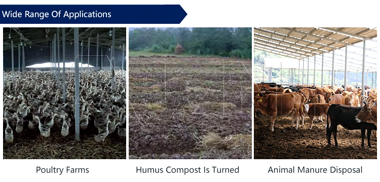 Se utiliza principalmente en la fermentación por apilamiento horizontal, con el doble efecto de remover y triturar, que no solo puede remover y mezclar uniformemente materiales como materias primas para abono orgánico, lodos y bacterias, sino también triturar las placas en los materiales fermentados.