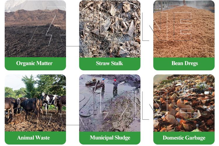Las materias primas que se pueden aplicar a la fermentación son principalmente excrementos animales como materia prima principal, paja, hierba, hojas, cáscara de arroz y otros residuos agrícolas y secundarios, como granos de vino, serrín, etc.